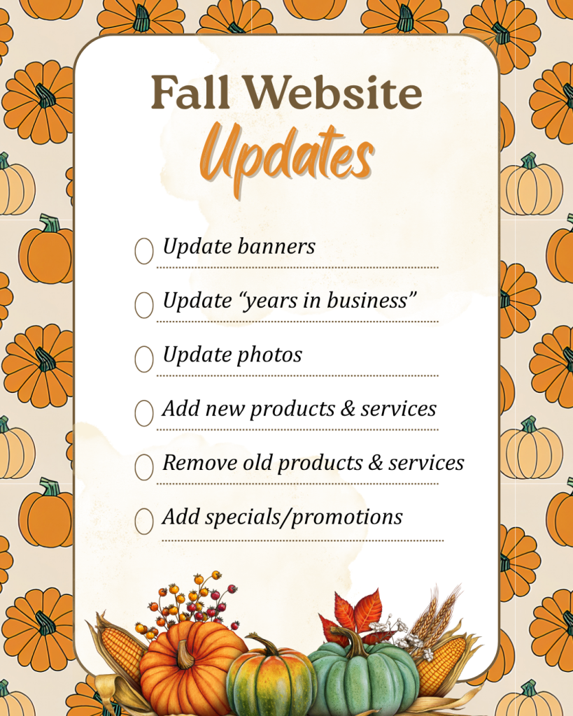 The change of seasons is an opportunity to set aside some time to review your website. Take a chunk of time and look at your website, review your website page by page, noting any information/photos that need to be changed or updated.